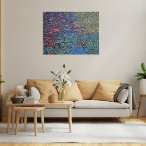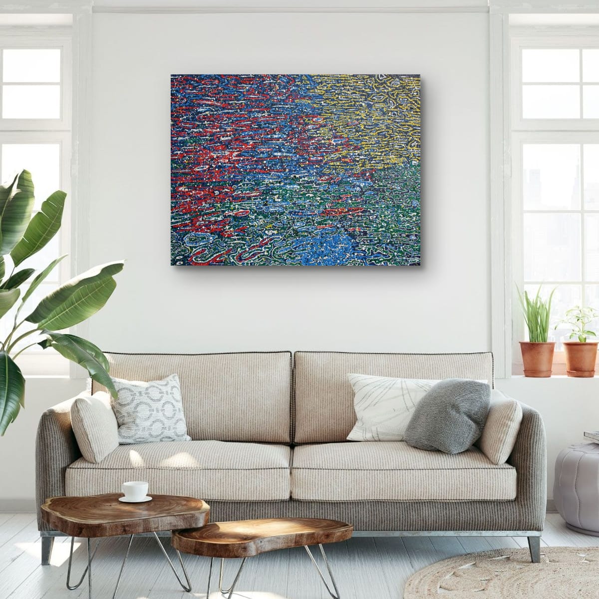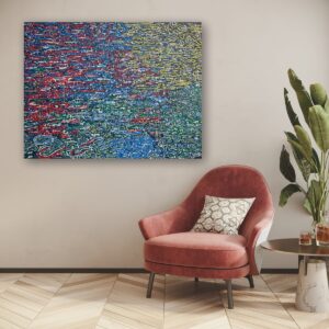 Lights on Water reveals a dynamic interplay of vibrant colors, where fluid patterns evoke a sense of movement and depth. The textured surface invites the viewer to explore the intricate details, revealing layers of reds, blues, greens, and yellows that dance across the canvas. Each brushwork element contributes to a captivating visual rhythm, making it a striking addition to any space. Perfect for those looking to infuse their environment with energy and creativity.