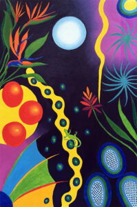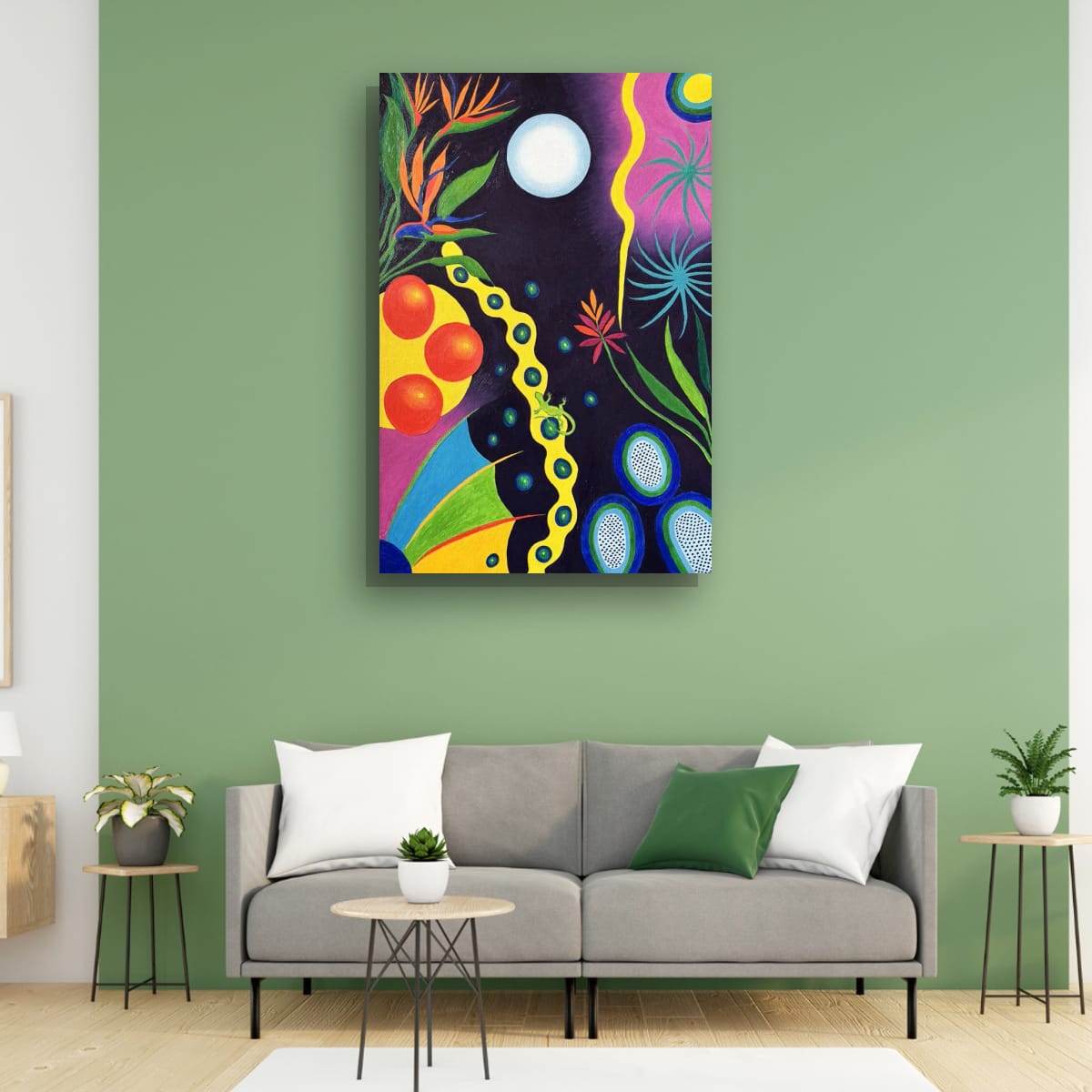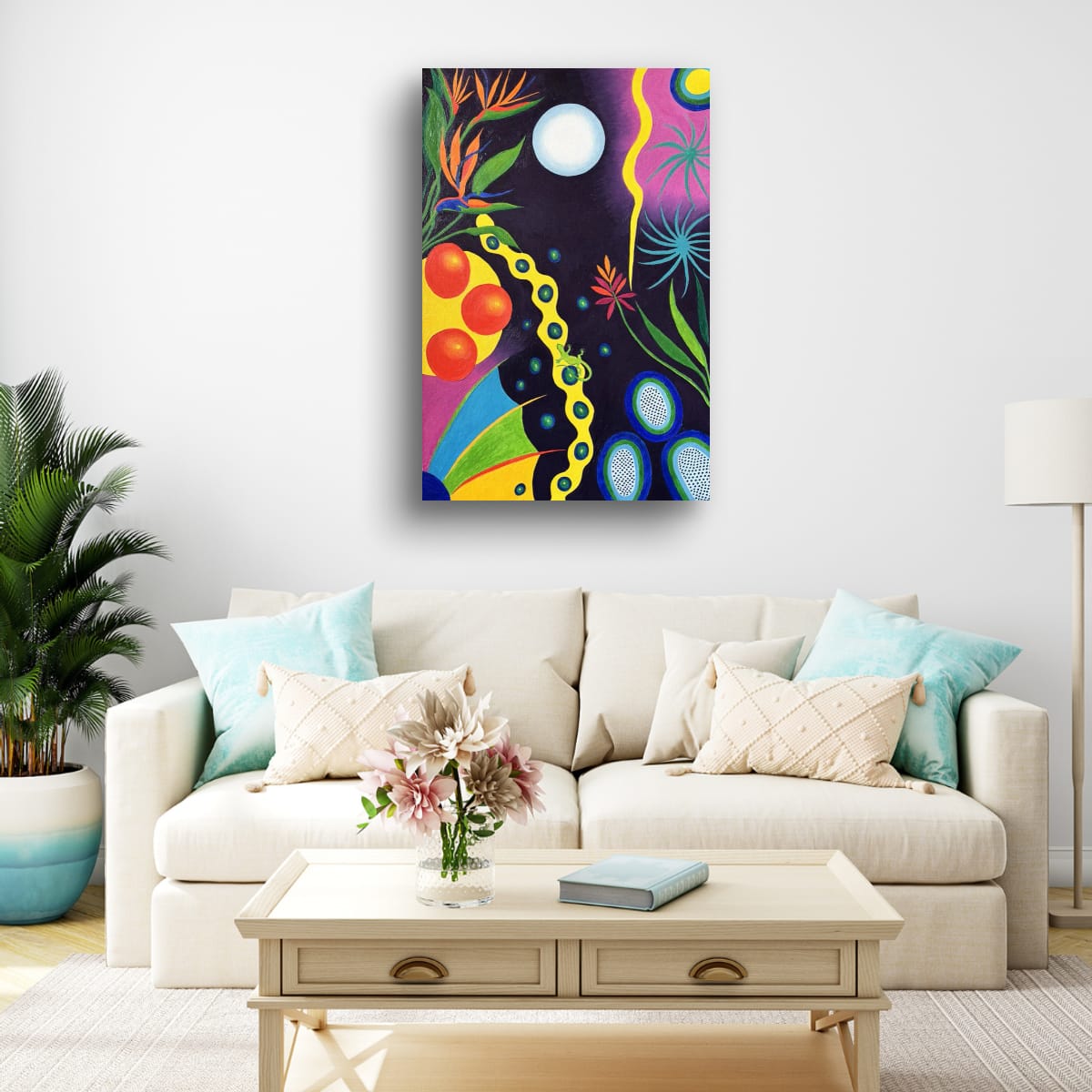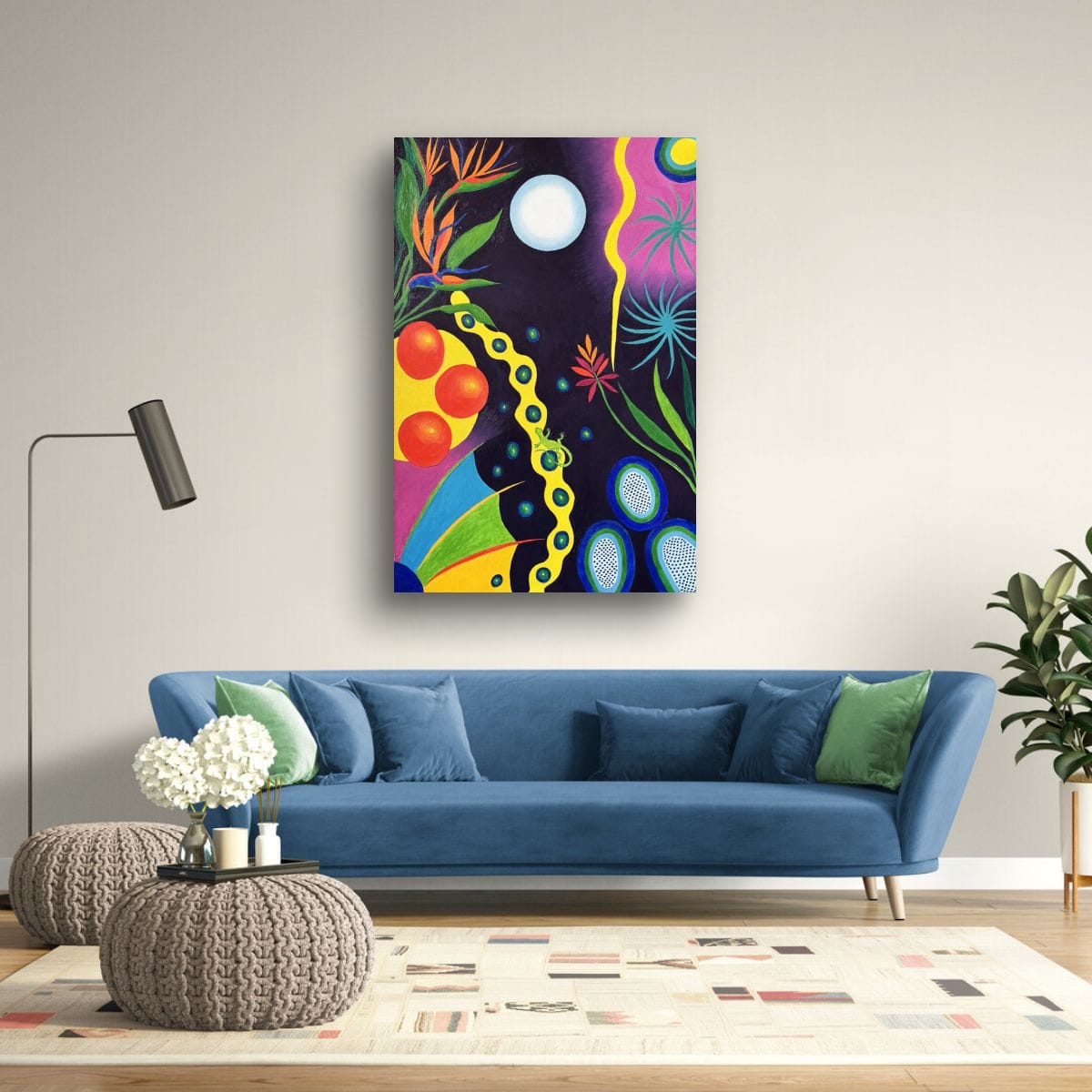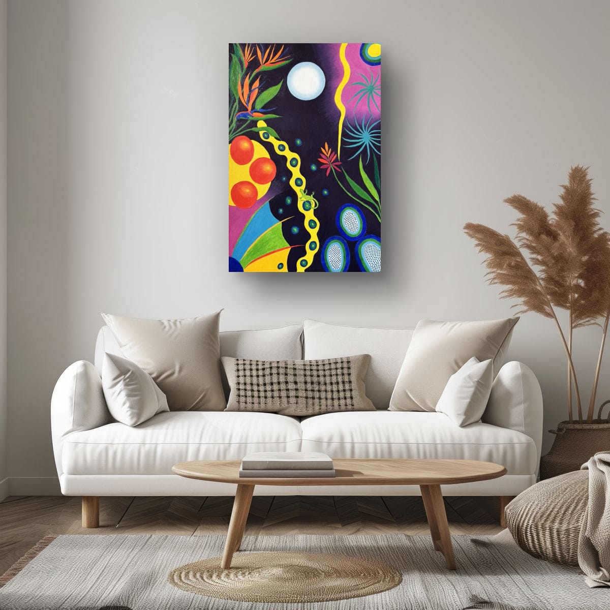 Midnight in the Garden presents a dynamic interplay of colors and shapes, evoking a sense of lively energy. Bold hues of flora and abstract forms create a captivating visual rhythm, while a playful green lizard adds a whimsical touch. The contrasting dark background enhances the vivid elements, inviting viewers to explore the intricate details. This piece is a striking addition to any space, infusing it with creativity and nature.