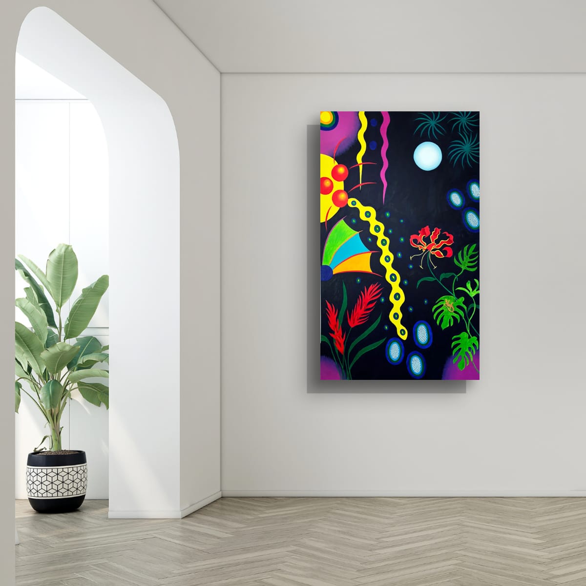 “Moonlight in the Garden” reveals a dynamic fusion of vibrant colors and abstract forms, inviting exploration and curiosity. The artwork features a captivating blend of organic shapes and geometric patterns that play against a dark backdrop, creating a striking visual contrast. Floral elements intertwine with bold lines, crafting a dreamlike landscape that encourages the viewer to wander through its depths. This piece is an excellent addition to any space, infusing it with energy and creativity.