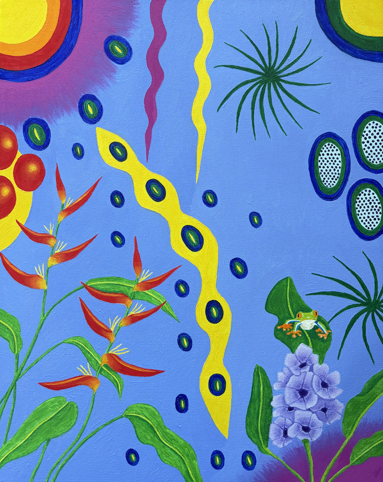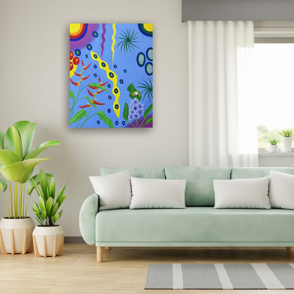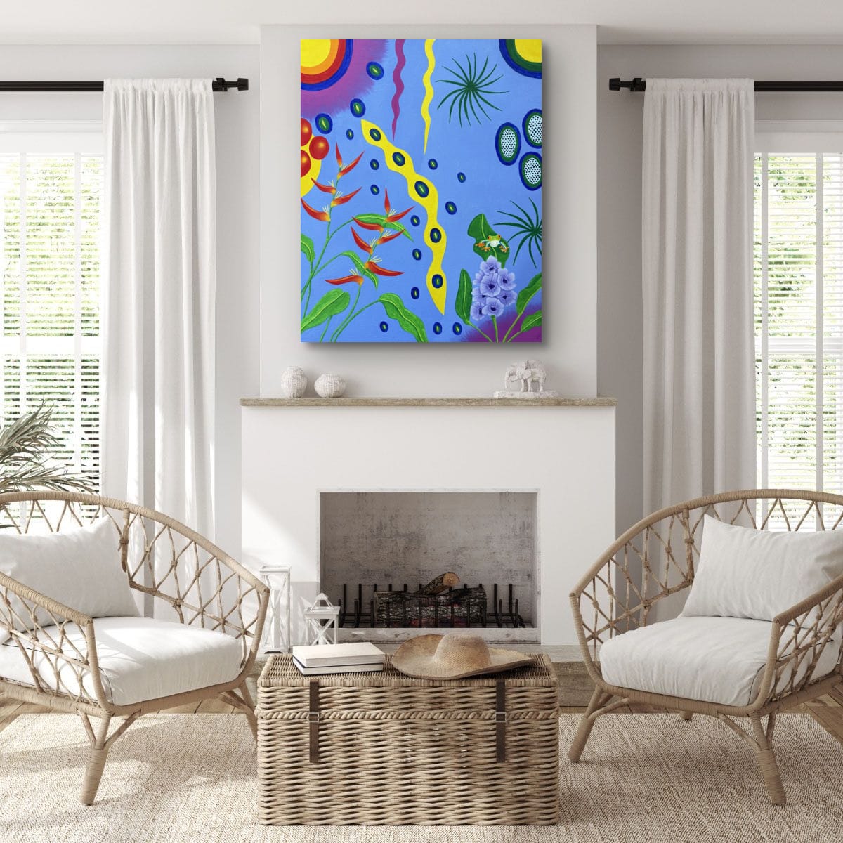 “Tropical Garden with Red-Eyed Tree Frog” presents a lively interplay of abstract shapes and tropical flora set against a serene blue sky. Bold yellow pods and concentric falling seeds punctuate floating organic forms while red-orange heliconia and clusters of violet blooms anchor the composition; a small green tree frog perched on a leaf provides a whimsical focal point. The painting’s crisp color contrasts and confident brushwork convey rhythmic movement and botanical detail that reward close viewing. Perfect for enlivening a living room, entryway, or workspace.